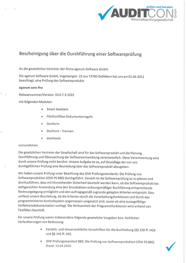 agorum core wird in regelmäßigen Abständen vom Wirtschaftsprüfer abgenommen. Das bedeutet, dass es bei sachgerechter Anwendung die Voraussetzung für die revisionssichere Archivierung bietet.